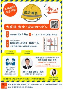 大宮区主催の「安全・安心のつどい」のお知らせです。 日時:令和8年2月14日(土) 13:30-15:45(開場13:00) 会場:RaiBoC HaII 市民会館おおみや 大ホール(大宮門街 7階) 来場者には防災グッ […]