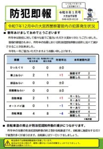令和7年12月の大宮西警察署管内の犯罪発生状況です。 昨年は特殊詐欺被害が大きく増加しました。 その多くは、固定電話にかかってきた犯人からの電話で被害に遭っています。 留守番電話はお使いですか? 騙されないために重要なこ […]